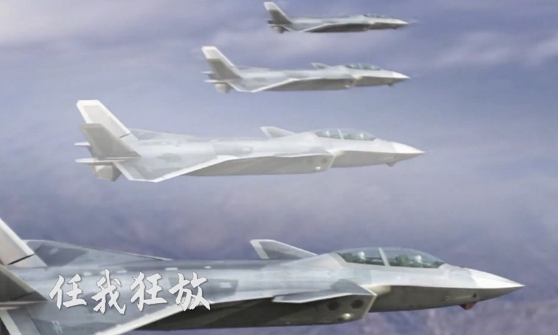 Vier zweisitzige J-20-Varianten sind in einem Werbevideo im Januar zum 10. Jahrestag des Erstflugs der J-20 zu sehen. Sie fliegen in Formation und werden von computergenerierten Bildern dargestellt. (Foto: Screenshot aus dem Video der Aviation Industry Corp of China)