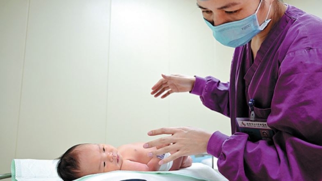 Eine Krankenschwester wiegt in einem Krankenhaus in Nanning, der Hauptstadt der autonomen Region Guangxi, ein Baby.