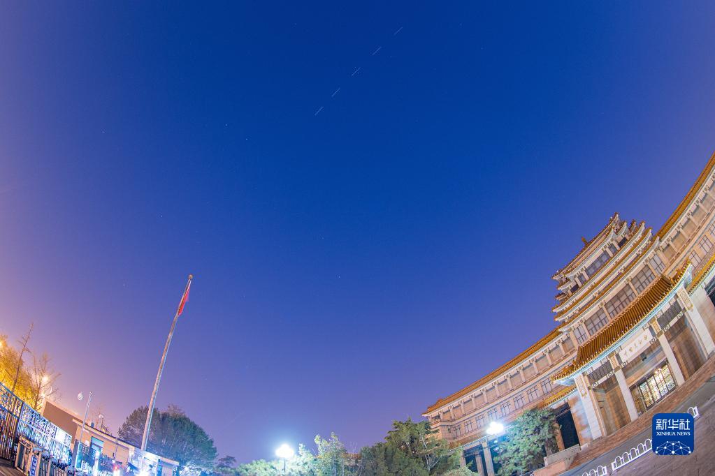 Die chinesische Raumstation Tiangong fliegt am 17. November über das Nationale Kunstmuseum in Beijing. (Die weiße Spur wird durch das Zusammenfügen verschiedener Fotos sichtbar.)