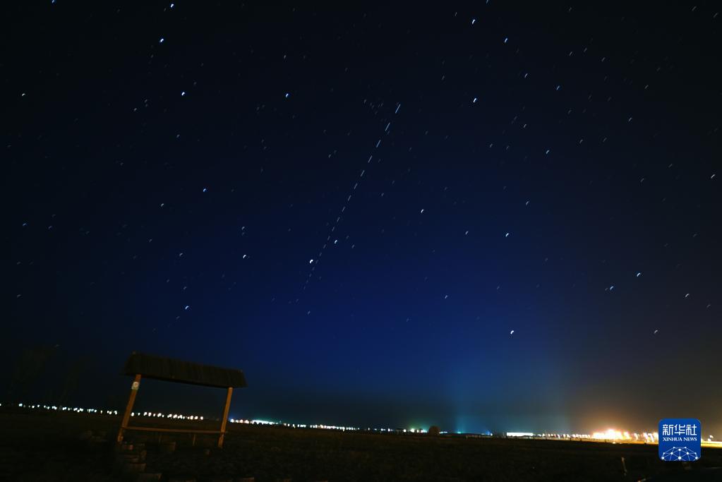 Die chinesische Raumstation Tiangong fliegt am 17. November über das Chilechuan-Grasland in Hohhot in der nordchinesischen Autonomen Region Innere Mongolei. (Die weiße Spur wird durch das Zusammenfügen verschiedener Fotos sichtbar.)