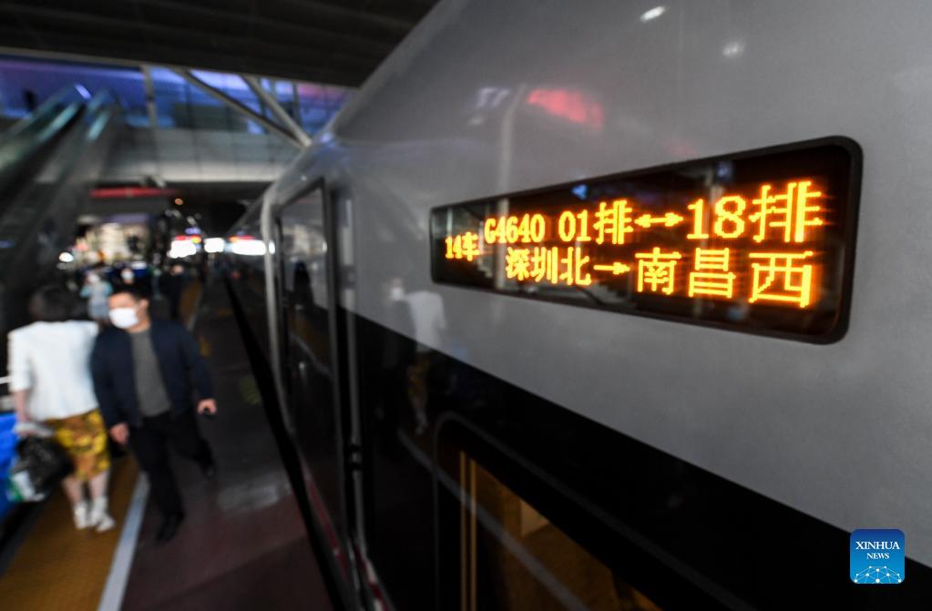 Fahrgäste bereiten sich am 10. Dezember 2021 am Nordbahnhof von Shenzhen in der südchinesischen Provinz Guangdong auf das Einsteigen in den ersten Hochgeschwindigkeitszug mit Ziel Nanchang Westbahnhof in der ostchinesischen Provinz Jiangxi vor. [Foto/Xinhua]