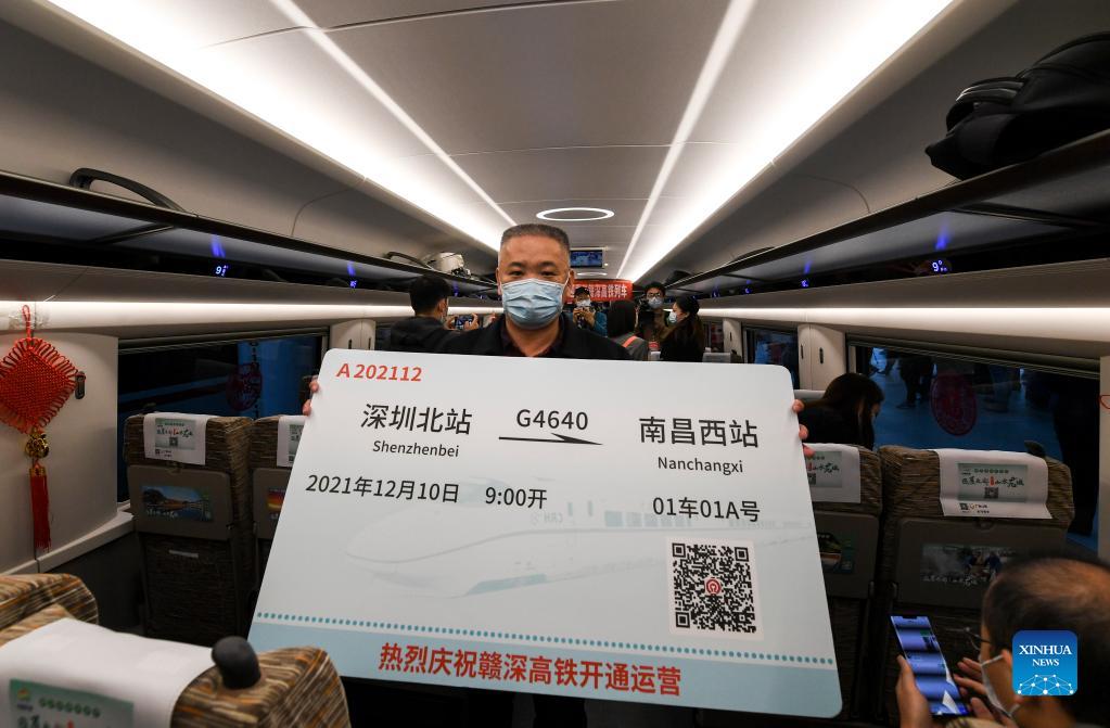 Ein Fahrgast zeigt am 10. Dezember 2021ein Gedenk-Fahrticket im ersten Hochgeschwindigkeitszug vom Nordbahnhof Shenzhen in der südchinesischen Provinz Guangdong zum Nanchang Westbahnhof in der ostchinesischen Provinz Jiangxi. [Foto/Xinhua]