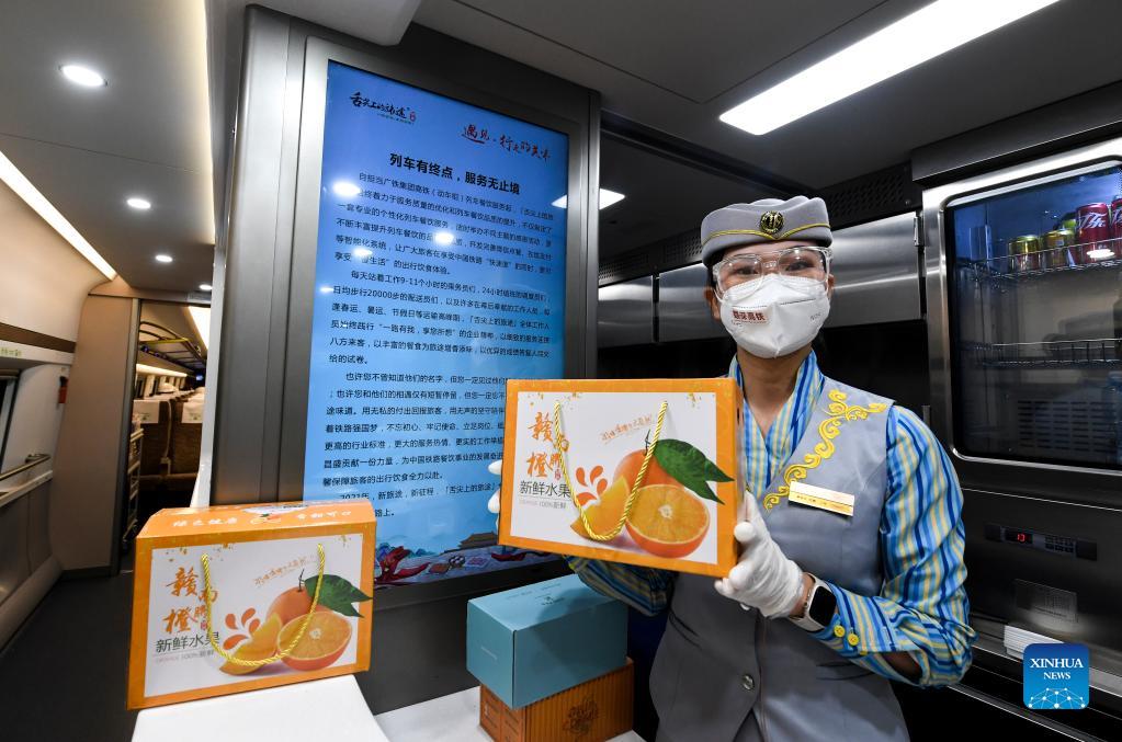 Eine Zugbegleiterin zeigt am 10. Dezember 2021 im ersten Hochgeschwindigkeitszug von Nordbahnhof Shenzhen in der südchinesischen Provinz Guangdong zum Nanchang Westbahnhof in der ostchinesischen Provinz Jiangxi Produkte aus Jiangxi. [Foto/Xinhua]