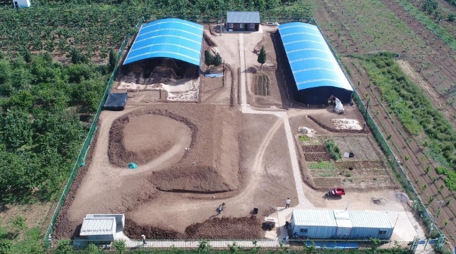 Das Luftbild vom 14. März 2019 zeigt die Ausgrabungsstätte des Mausoleums der Kaiserinwitwe Bo, der Mutter von Kaiser Wendi der Westlichen Han-Dynastie (202 v. Chr.- 25 n. Chr.), im Dorf Jiangcun am östlichen Stadtrand von Xi'an im Nordwesten der chinesischen Provinz Shaanxi.