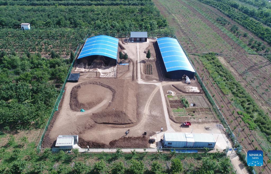 Das Luftbild vom 15. Mai 2019 zeigt die Ausgrabungsstätte Nr. 1 des Mausoleums im Dorf Jiangcun am östlichen Stadtrand von Xi'an in der nordwestchinesischen Provinz Shaanxi.