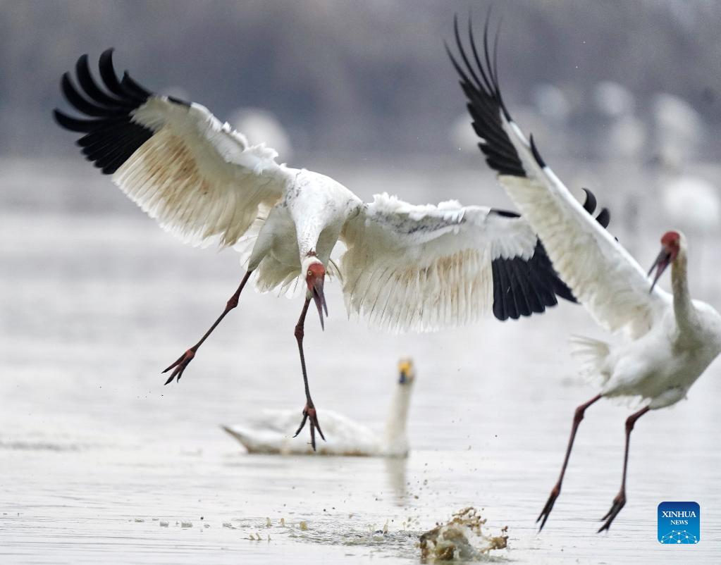 Weiße Kraniche tummeln sich am 1. Januar 2022 in einem speziellen Schutzgebiet für weiße Kraniche am Poyang-See in Nanchang in der ostchinesischen Provinz Jiangxi. (Xinhua/Wan Xiang)