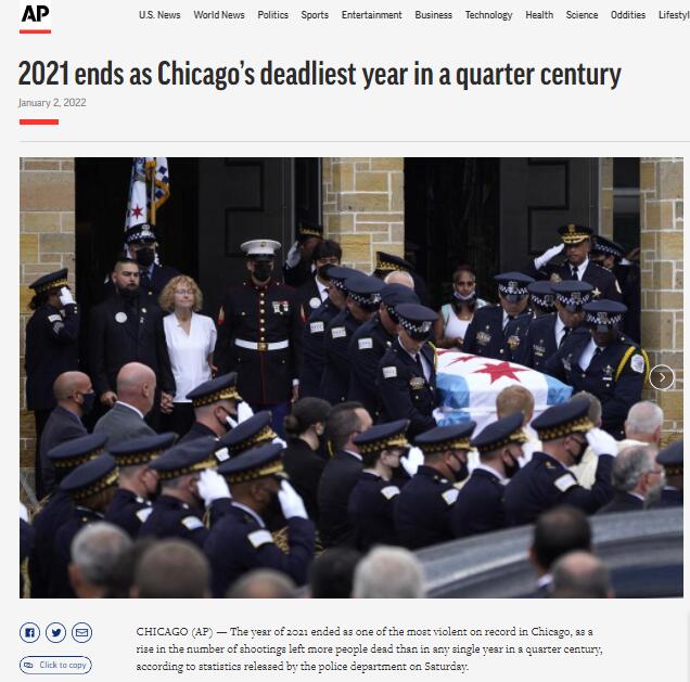 Das Jahr 2021 endete laut einem AP News-Bericht vom 2. Januar als eines der gewalttätigsten Jahre Chicagos, da laut einer am Samstag veröffentlichten Statistik der dortigen Polizei mehr Menschen starben als in jedem Jahr seit einem Vierteljahrhundert.