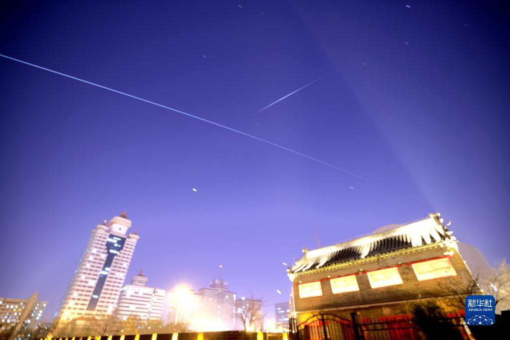 Die chinesische Raumstation „Tiangong“ fliegt am 19. Dezember 2021 über das Xibianmen-Tor in Beijing. (Die weiße Spur wird durch das Zusammenfügen verschiedener Fotos sichtbar.)