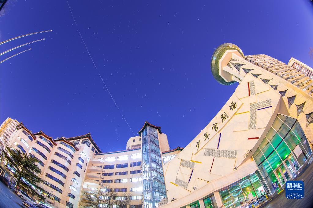 Die chinesische Raumstation „Tiangong“ fliegt am 16. Dezember 2021 über den Kinderpalast im Dongcheng-Bezirk in Beijing. (Die weiße Spur wird durch das Zusammenfügen verschiedener Fotos sichtbar.)