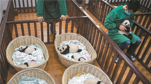 In der Shenshuping-Schutzbasis im Großen Panda-Nationalpark in der südwestchinesischen Provinz Sichuan wurden im vergangenen Jahr 24 Jungtiere aus 15 Embryonen gezüchtet, darunter neun Zwillingspaare. Damit lag die Überlebensrate bei 100 Prozent.