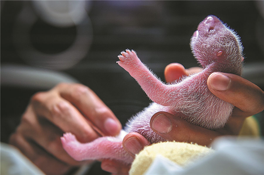 Eine Krankenschwester hilft einem Panda-Welpen beim Stuhlgang.