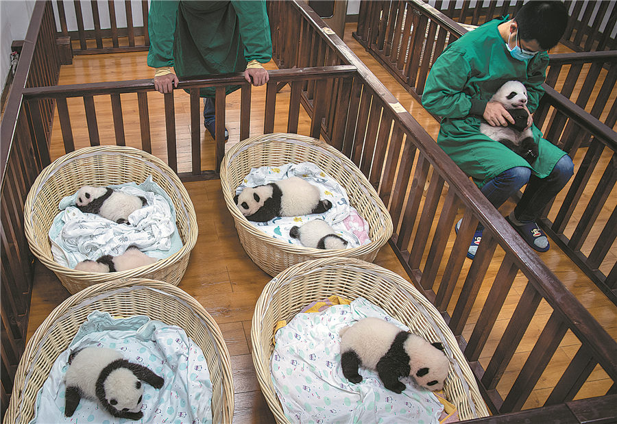 Zwei Krankenschwestern kümmern sich um acht Pandabären, die im Jahr 2021 geboren wurden.