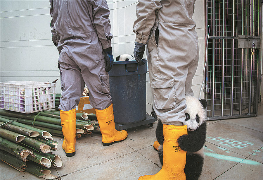Die Fütterer der Großen Pandas bereiten sich auf das Wiegen der vier Monate alten Jungtiere vor.