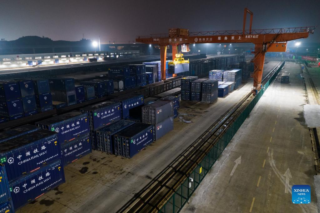 Die Luftaufnahme vom 6. Januar 2022 zeigt die Verladung von Gütern auf einen Güterzug, der von Huaihua in der zentralchinesischen Provinz Hunan aus nach Laos fährt.