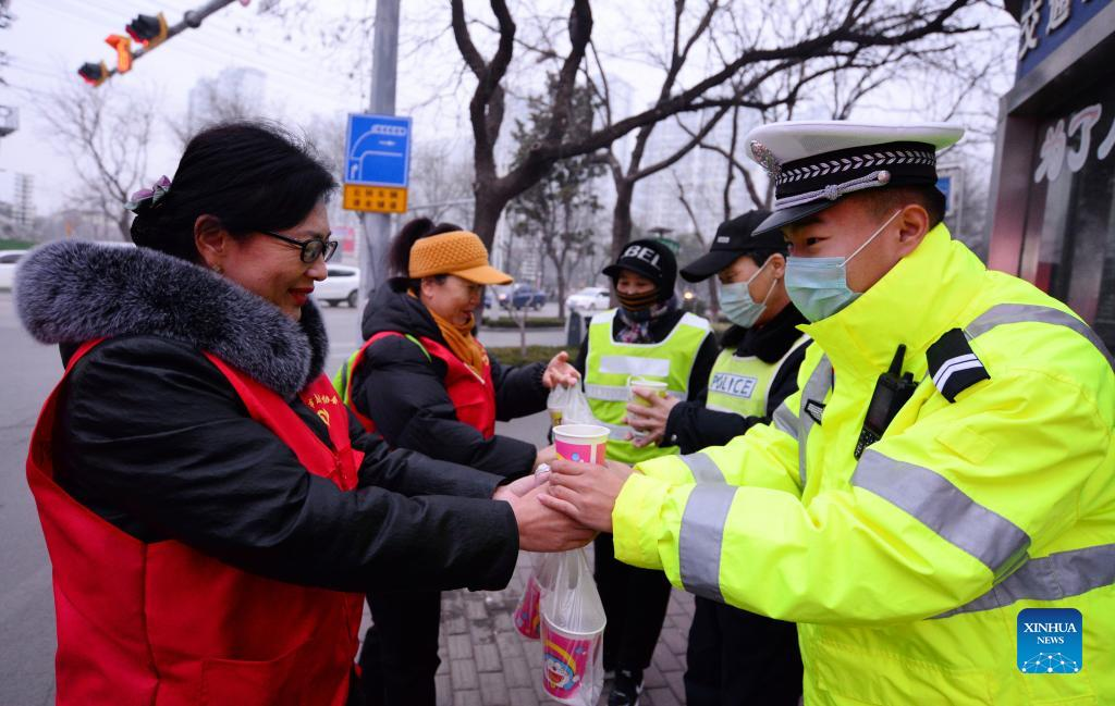 Freiwillige servieren am 10. Januar 2022 kostenlosen Laba-Brei in der Stadt Tengzhou in der ostchinesischen Provinz Shandong. (Foto von Li Zhijun/Xinhua)