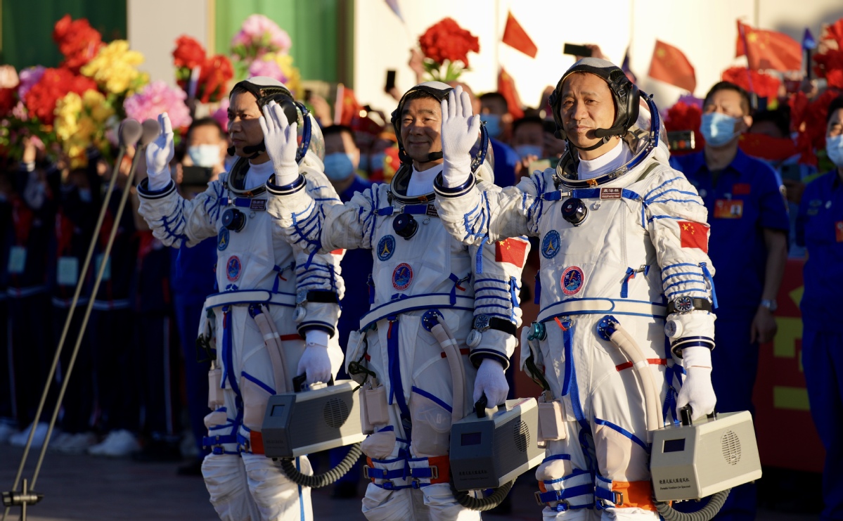 Im Satellitenstartzentrum Jiuquan in Nordwestchinas findet eine Abschiedszeremonie für drei chinesische Astronauten der bemannten Weltraummission Shenzhou XII statt. [Foto von Su Dong/für chinadaily.com.cn, 17. Juni 2021]