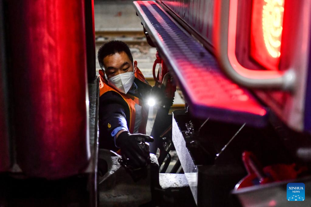 Li Ke prüft am 25. Januar 2022 die Verbindung der Zugwaggons in Taiyuan.