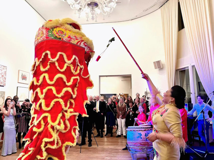 Nach dem traditionellen chinesischen Mondkalender startete am 1. Februar das neue Jahr des Tigers. Daher lud der gemeinnützige Kulturförderverein Gesellschaft für Deutsch-Chinesischen kulturellen Austausch (GeKA, 德中文化交流基金会) am 31. Januar 100 hochkarätige Gäste aus Wirtschaft, Politik, Kultur/Kunst und Gesellschaft zu einem chinesischen Neujahrsempfang mit einer Ausstellungseröffnung „Eine China-Reise. Zeitgenössische Tuschemalereien (A Chinese Journey. Contemporary Ink)“ ein. Die Feier fand unter strengen 2G plus Regelungen statt. Trotz allen Einschränkungen der Pandemie war die feierliche Stimmung unter den Gästen herzlich und entspannt, so feierten die meisten ins Neujahr hinein. Zum chinesischen Neujahrsfest wurden neben dem traditionellen Löwentanz, modern interpretierter PiPa-Musik, feinem authentischen Essen und auch internationale Gerichte serviert. Dazu wurde chinesischer Wuliangye-Schnaps angeboten, um den Gästen ein Stück authentischer chinesischer Trinkkultur zu vermitteln. Die Gastgeberin Yu Zhang (张彧)ist in der deutschen Hauptstadt für ihre Einladungen zu Kulturabenden bekannt: Sie achtet auf ein Gesamt-Erlebnis mit vielen Kultur-Highlights für die eingeladenen Gäste, zu denen auch der ehemalige Regierende Bürgermeister Michael Müller, die Präsidentin des Deutschen Wissenschaftszentrums Berlin Jutta Allmendinger oder Blaublütige aus dem Hause von Preußen und von Bismarck gehörten. Aber auch bekannte Kunstsammler wie Heiner Wemhöner und Timo Mettinen waren neben zahlreichen Museumsdirektoren oder bekannten Celebrities aus dem ShowBiz wie Komödiant Dieter Nuhr, Schauspielerin Luise Belford oder der bekannte Jungunternehmer Andre Braun zählten zu ihren Gästen. Alle folgten der Einladung der Gastgeberin Zhang, um gemeinsam das chinesische Neujahr zu feiern und die zeitgenössische Tuschemalerei zu genießen.