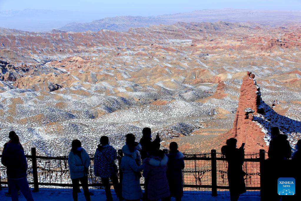 Besucher genießen am 9. Februar 2022 die schneebedeckten Danxia-Berge am Pingshan-See in Zhangye in der nordwestchinesischen Provinz Gansu. Diese sehr spezielle Landschaftsform ist durch rotes terrigenes Sedimentgestein entstanden. (Foto: Chen Li/Xinhua)