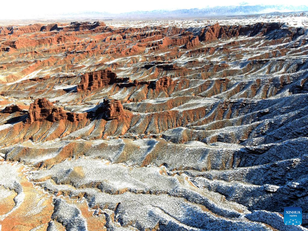 Das am 9. Februar 2022 aufgenommene Foto zeigt die schneebedeckten Danxia-Berge, die durch die typisch rötlich gefärbten Sandsteine gekennzeichnet sind, im Danxia National Geological Park in Zhangye in der nordwestchinesischen Provinz Gansu. (Foto von Chen Li/Xinhua)