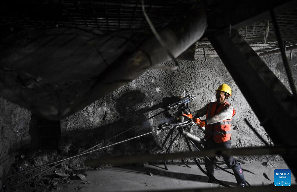 Ein Mitarbeiter ist am 9. Februar 2022 in einem Tunnel der Chongqing-Kunming-Hochgeschwindigkeitsstrecke beschäftigt.