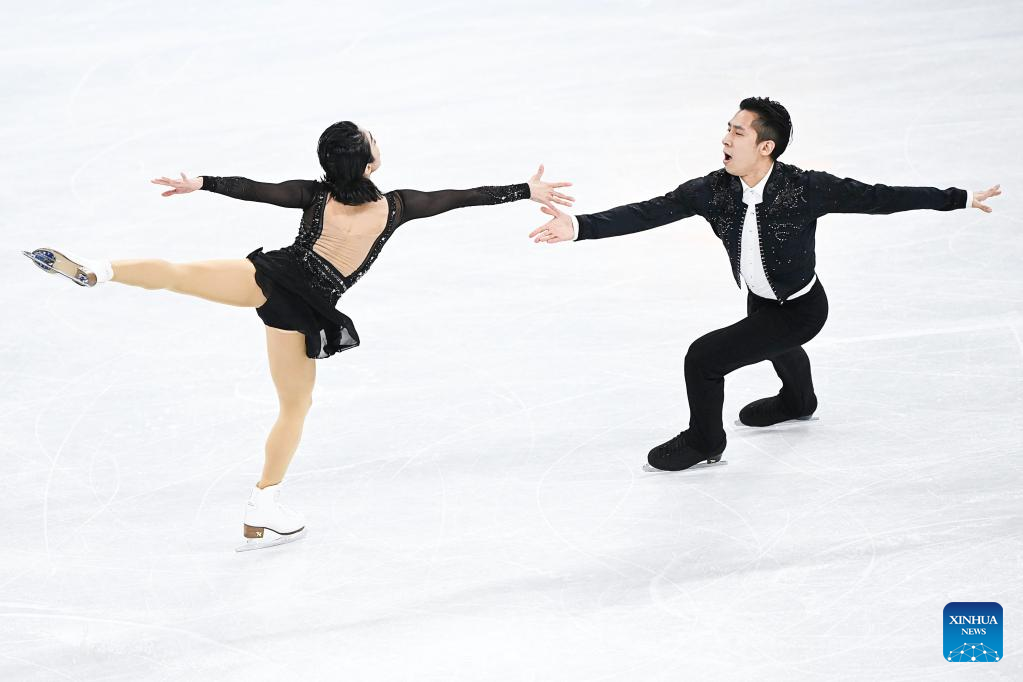 Sui Wenjing (vorne) und Han Cong aus China treten am 18. Februar 2022während des Eiskunstlauf-Paarlauf-Kurzprogramms der Olympischen Winterspiele 2022 in Beijing im Nationalen Hallenstadion auf. (Xinhua/Cao Can)