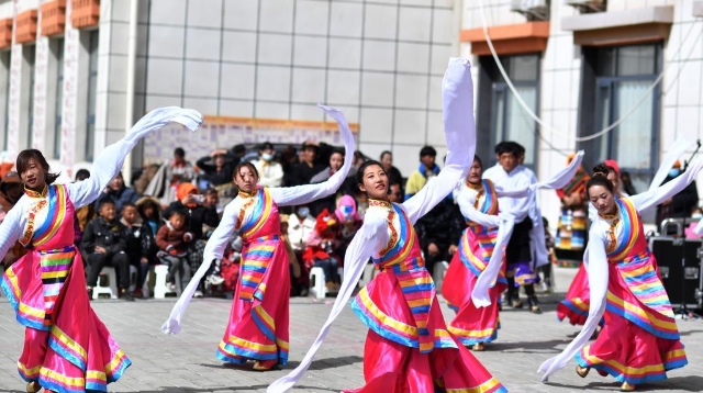 Hirten in der Umsiedlungsanlage Rongma tanzen am 28. Februar zur Feier des kommenden Tibetischen Neujahrs. (Foto von Jogob, Xinhua)