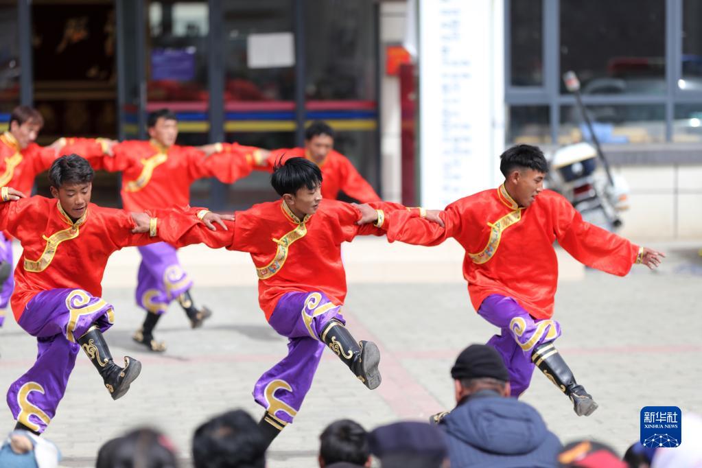 Hirten in der Umsiedlungsanlage Rongma tanzen am 28. Februar zur Feier des kommenden Tibetischen Neujahrs. (Foto von Jogob, Xinhua)