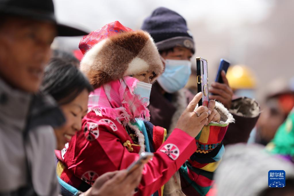 Hirten machen am 28. Februar Fotos von den künstlichen Darbietungen zur Feier des Tibetischen Neujahrs in der Umsiedlungsanlage Rongma (Foto von Jiang Fan, Xinhua). Dank der gestiegenen Einkommen und der besseren Telekommunikationssignale wegen der niedrigeren Höhe benutzt fast jeder Hirte mittlerweile ein Smartphone.