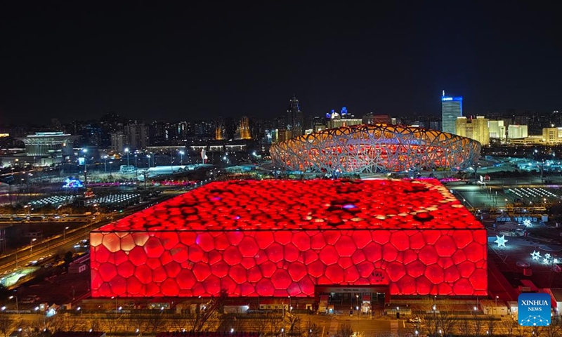 Das Foto vom 4. Februar 2022 zeigt das Nationalstadion, auch bekannt als “Vogelnest”, und das Nationale Schwimmzentrum, den „Eiswürfel“, in Beijing. (Foto: Xinhua)