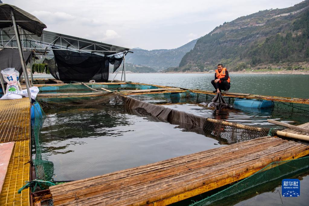 Ein Mitarbeiter in der Domestizierungsbasis für seltene Fische im Gebiet des Drei-Schluchten-Stausees kontrolliert das Wachsen von gezüchteten Jangtse-Stören. (Foto von Tang Yi, Xinhua, 25. Februar 2022)