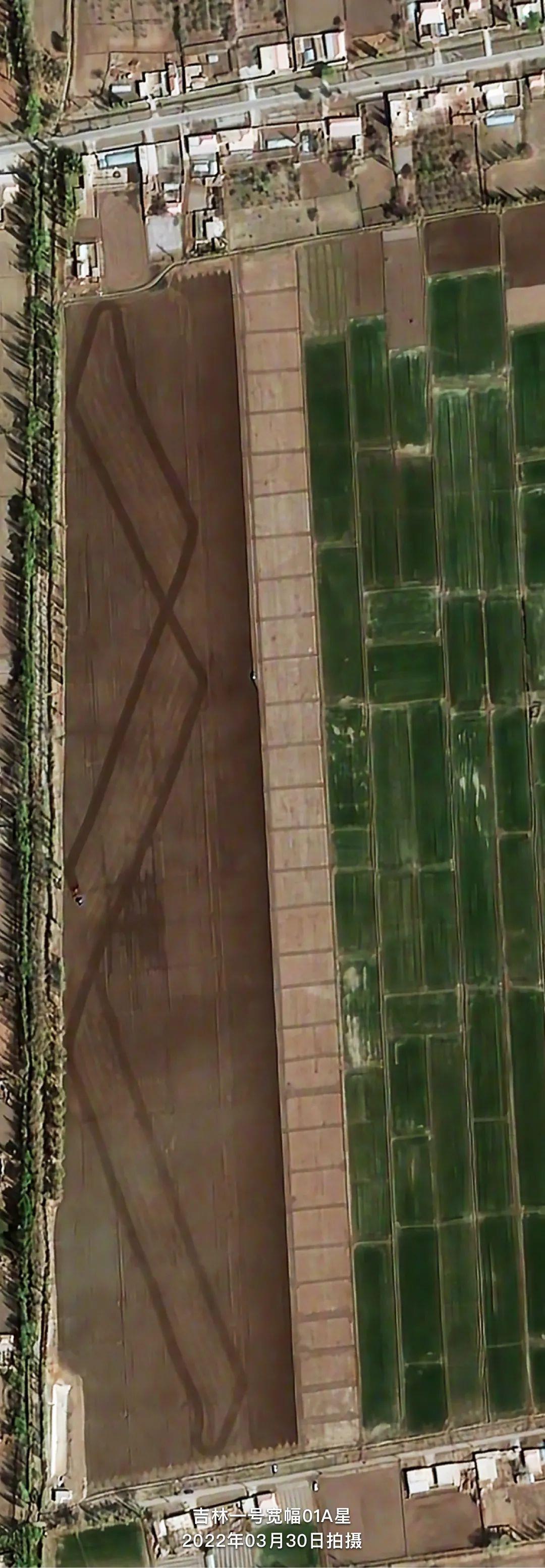 Ein hochauflösendes Satellitenbild vom Fernerkundungssatellitensystem „Jilin-1“ zeigt den maschinellen Anbau von Baumwolle in Xinjiang.