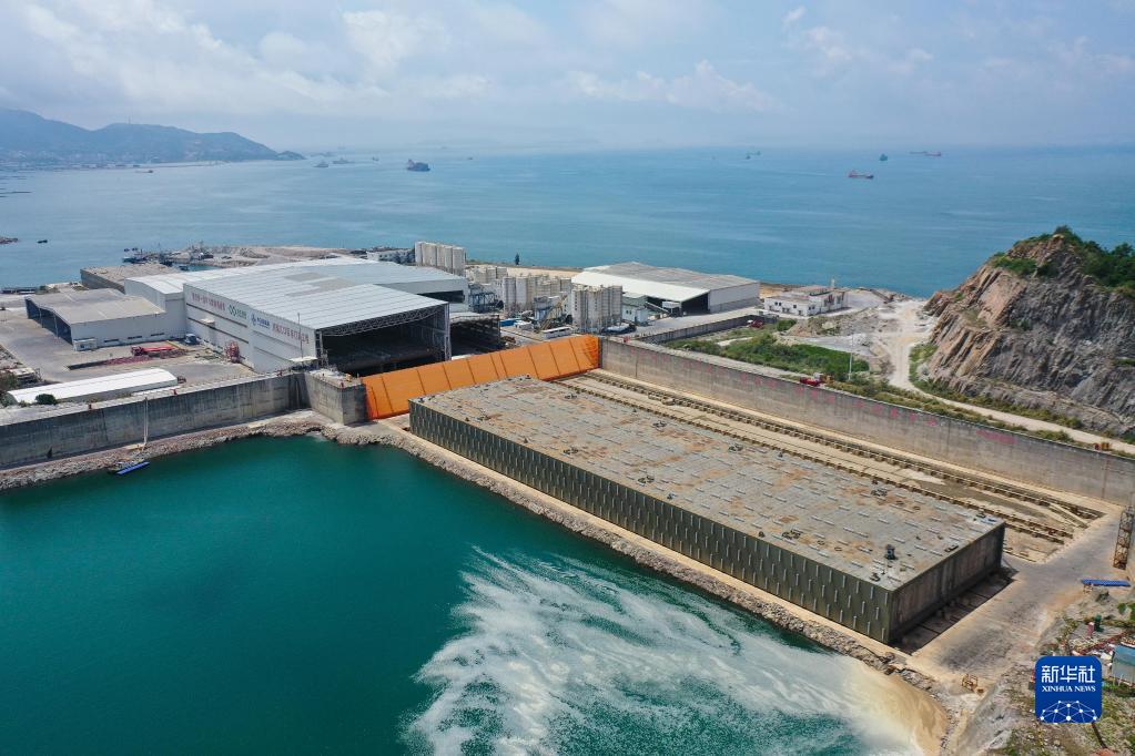 Drei Senkkästen für den Absenktunnel der Shenzhen-Zhongshan-Brücke werden in der intelligenten Fabrik von CCCC Fourth Barbor Engineering Cooperation Limited auf der Niutou-Insel erbaut. (Foto vom 24. April, Liu Dawei/Xinhua)
