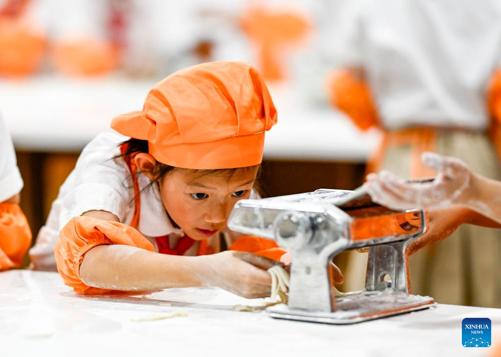 Ein Schüler lernt am 26. Mai 2022 im Unterricht der Chongguang-Grundschule in der südwestchinesischen Stadt Chongqing die Herstellung von Nudeln. Die Chongguang-Grundschule hat die Fertigkeiten der Lebensmittelherstellung in den Unterricht eingeführt und gleichzeitig die lokalen Besonderheiten der traditionellen Essenskultur und die traditionelle chinesische Kultur der Jahreszeiten behandelt, um das Leben der Schüler mit dem Wissen über die lokalen Traditionen zu bereichern. (Xinhua/Huang Wei)
