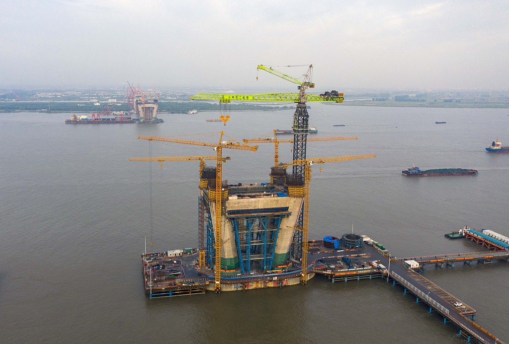 Bauarbeiter sind mit einem Test des Turmdrehkrans W12000-450 auf der Baustelle des nördlichen Hauptturms auf der Jangtse-Brücke zwischen Changzhou und Taizhou beschäftigt. (Foto vom 7. Juni, VCG)