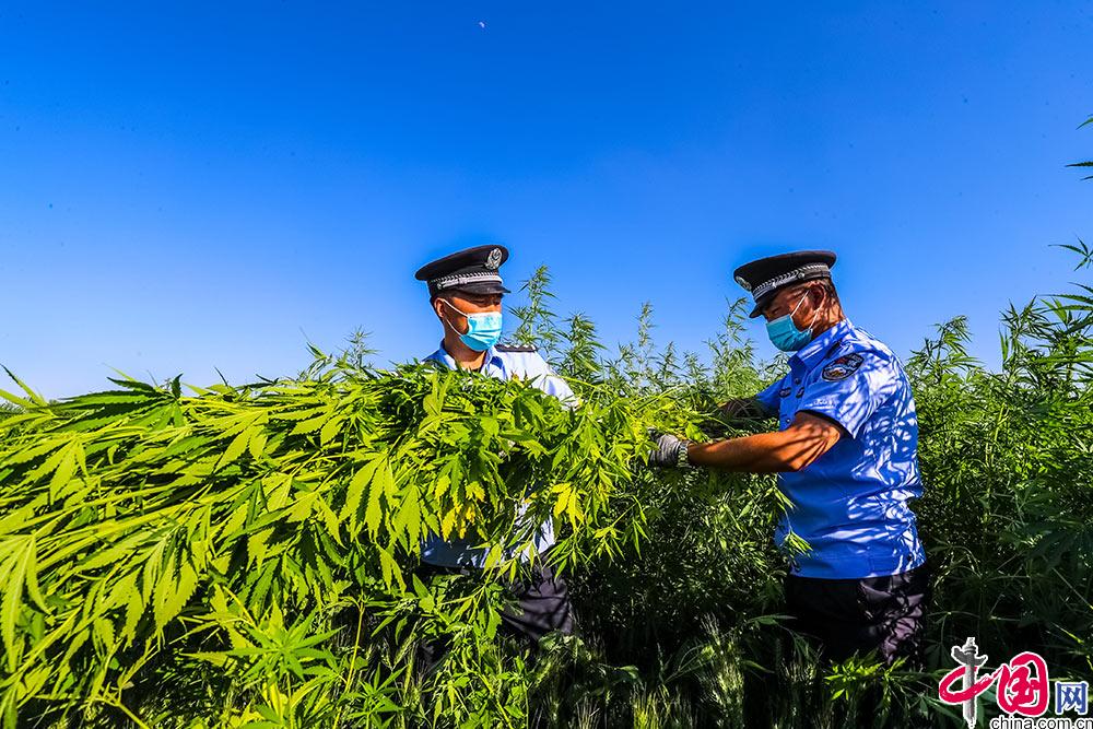 Polizisten entfernen die Hanfpflanzen.