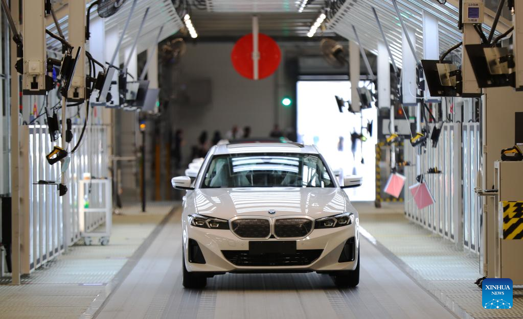 BMW i3 Elektroautos sind während der Einweihungszeremonie des Werks Lydia von BMW Brilliance Automotive (BBA) im Tiexi-Bezirk in Shenyang am 23. Juni 2022 zu sehen. (Xinhua/Yang Qing)