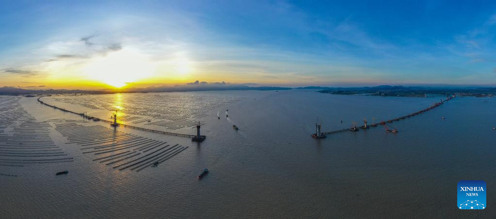 Die Luftaufnahme vom 27. Juni 2022 zeigt die Baustelle einer 31 Kilometer langen Querverbindung zwischen den Städten Jiangmen und Zhuhai in der südchinesischen Provinz Guangdong. Die Verbindung soll im Jahr 2024 für den Verkehr freigegeben werden. (Xinhua/Liu Dawei)