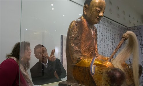 Die chinesische „Zhanggong Zushi“-Statue wird am 3. März 2015 von Besuchern des Ungarischen Naturkundemuseums in Budapest bewundert. Dateifoto: Xinhua/Attila Volgyi