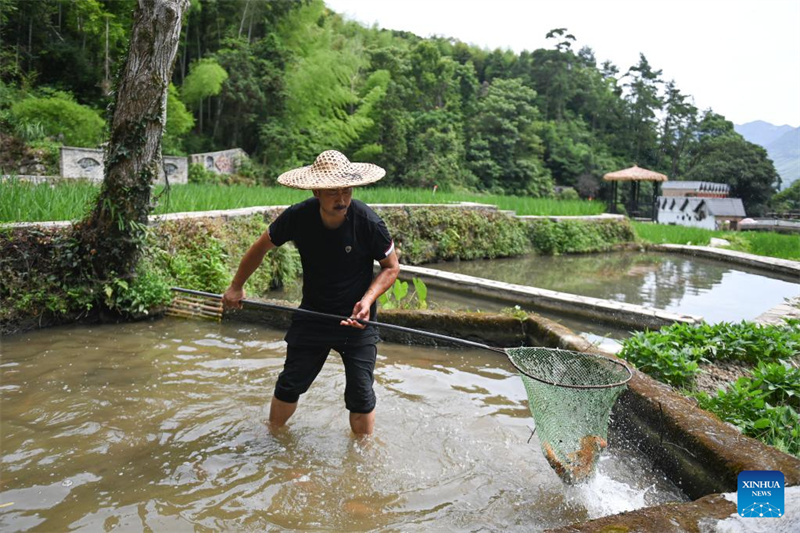 Ein Bauer fängt am 19. Juli 2022 in einem Schutzgebiet des Reis-Fisch-Kokultursystems im Landkreis Qingtian in der ostchinesischen Provinz Zhejiang Fische.