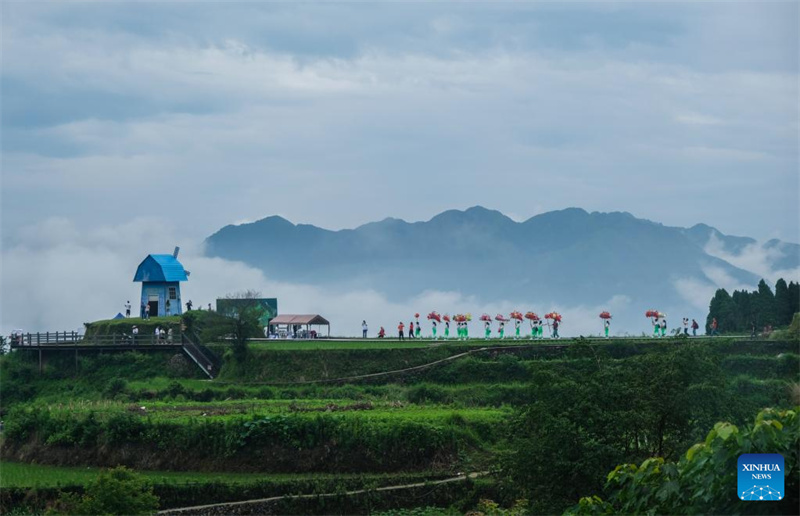 Auf dieser Luftaufnahme vom 11. Juni 2020 feiern Dorfbewohner in traditionellen Kleidern, als sie in der Gemeinde Xiaozhoushan, Landkreis Qingtian, in der ostchinesischen Provinz Zhejiang, beginnen den Boden zu pflügen und Fischbrut in die Reisfelder einzusetzen.
