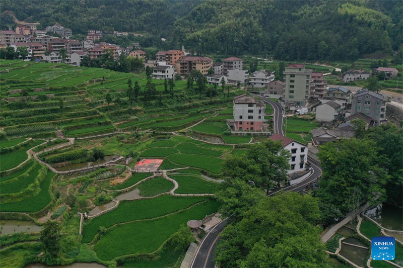 Eine Luftaufnahme vom 18. Juli 2022 zeigt ein Schutzgebiet des Reis-Fisch-Kokultursystems im Landkreis Qingtian in der ostchinesischen Provinz Zhejiang.