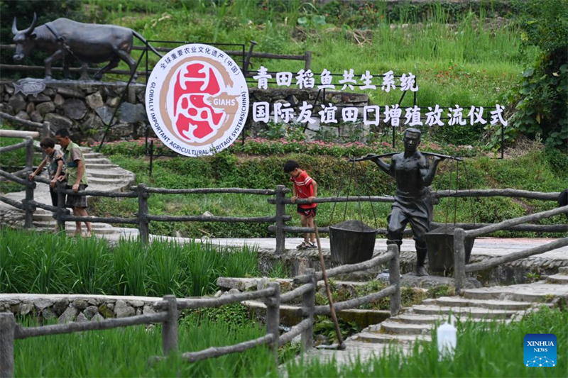 Menschen besichtigen am 18. Juli 2022 ein Schutzgebiet des Reis-Fisch-Kokultursystems im Landkreis Qingtian in der ostchinesischen Provinz Zhejiang.