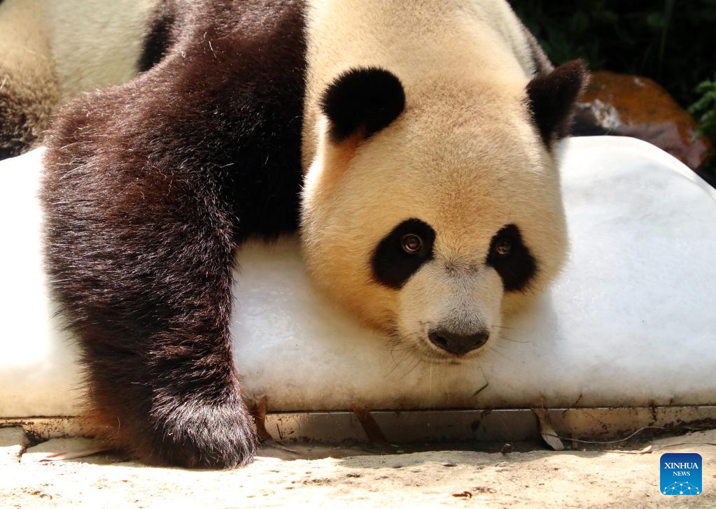 Der Große Panda Shuaishuai liegt am 22. Juli 2022im Chimelong Safari Park in Guangzhou in der südchinesischen Provinz Guangdong auf einem riesigen Eisblock. Der Zoo versucht in letzter Zeit mit allen Mitteln, den Tieren dabei zu helfen, die Sommerhitze zu überstehen. (Xinhua/Huang Guobao)