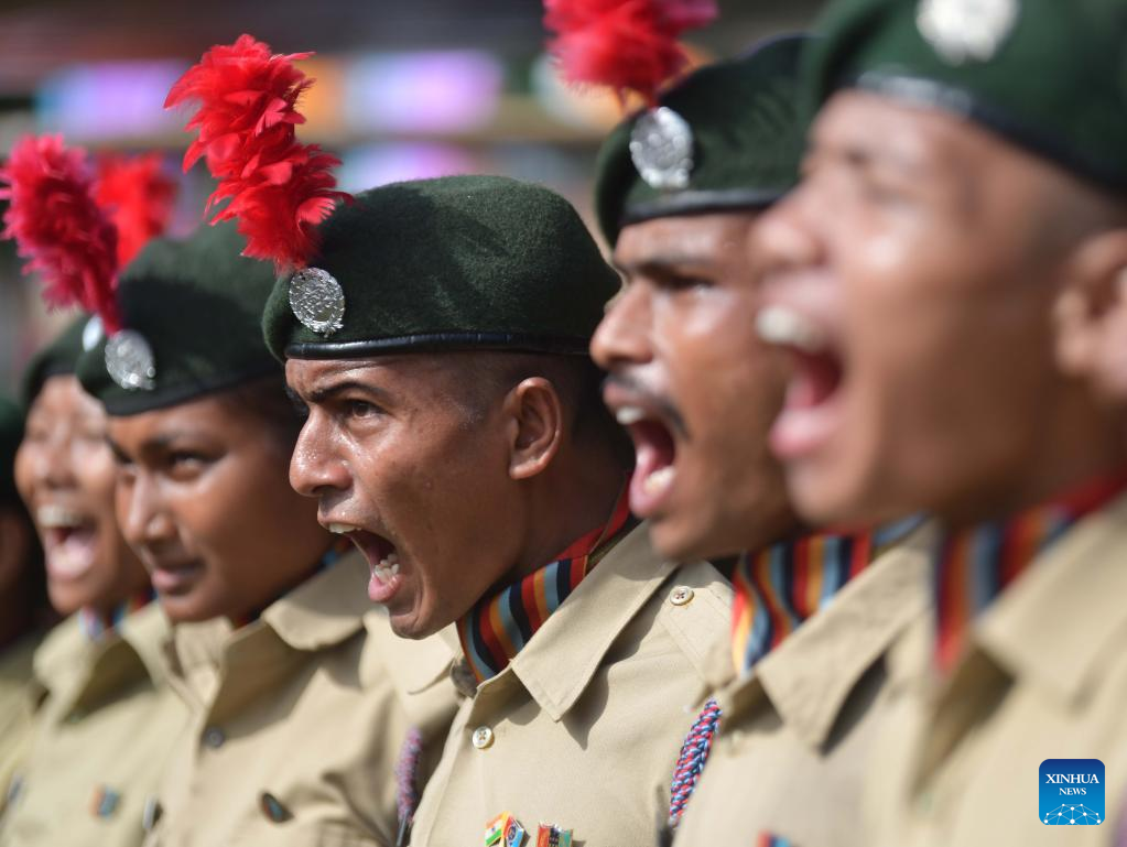 Soldaten nehmen an der Parade während der Feierlichkeiten zum Unabhängigkeitstag Indiens auf dem Gelände der Assam Rifles in Agartala, der Hauptstadt von Indiens nordöstlichem Bundesstaat Tripura, teil. (Foto vom 15. August, Str/Xinhua)