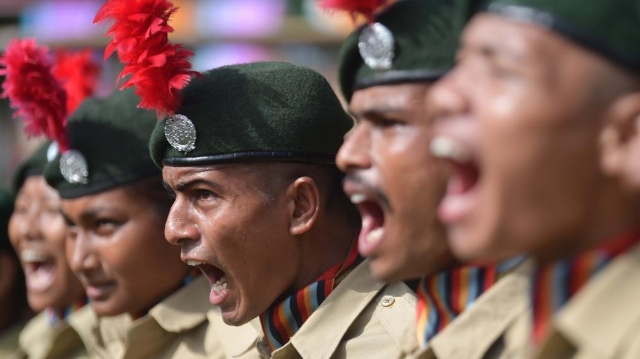 Soldaten nehmen an der Parade während der Feierlichkeiten zum Unabhängigkeitstag Indiens auf dem Gelände der Assam Rifles in Agartala, der Hauptstadt von Indiens nordöstlichem Bundesstaat Tripura, teil. (Foto vom 15. August, Str/Xinhua)