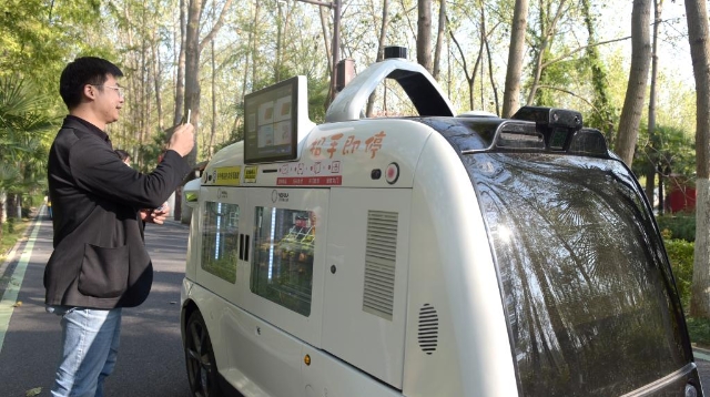 Im Binhu National Forest Park in Hefei in der ostchinesischen Provinz Anhui wurde ein Projekt zur Förderung selbstfahrender Fahrzeuge umgesetzt. Seit Kurzem werden autonom fahrende Reisebusse, unbemannte Verkaufsfahrzeuge, unbemannte Kehrmaschinen und andere Fahrzeuge für Touristen eingesetzt. (Xinhua/Guo Chen)