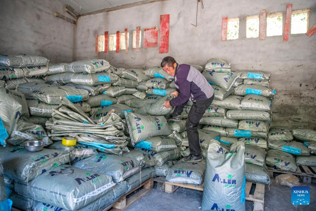 Ein Mitarbeiter transportiert einen Sack Fischfutter in einer Kaltwasser-Fischzuchtanlage im Dorf Ming'an im südwestchinesischen Chongqing. (Xinhua/Huang Wei)