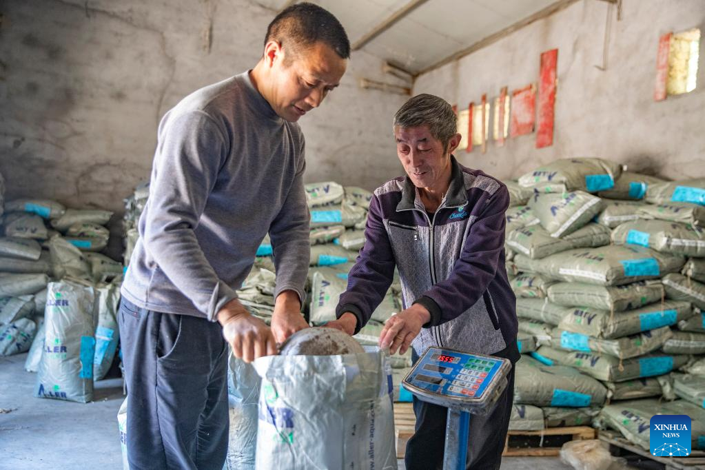 Mitarbeiter packen Fischfutter in einer Kaltwasser-Fischzuchtanlage im Dorf Ming'an in Chongqing, aus. (Xinhua/Huang Wei)