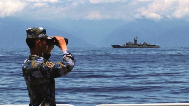 Ein Soldat der Chinesischen Volksbefreiungsarmee (VBA) schaut sich am 5. August 2022 mit einem Teleskop um, während die Marine des östlichen Kommandos der VBA das militärische Manöver rund um die Insel Taiwan fortsetzt. (Foto von Xinhua)
